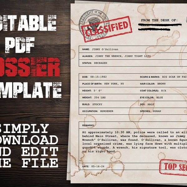 Editable PDF Dossier Template Digital Download Customizable Top Secret
