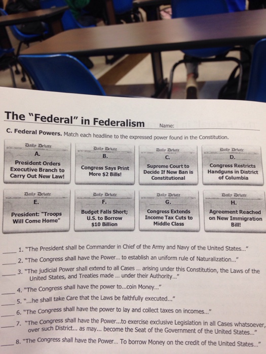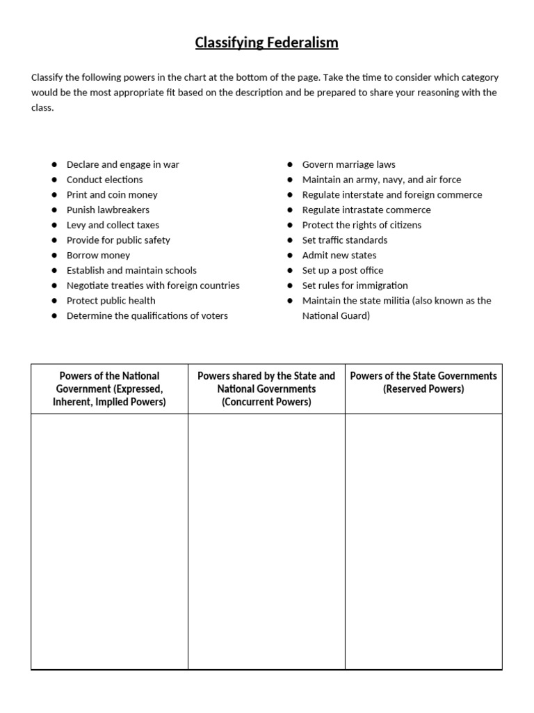 Federalism Classifying Powers Worksheet Federalism: The Division of