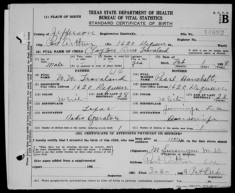 Travland Ancestry: Clayton Arno Travland birth certificate and obituary