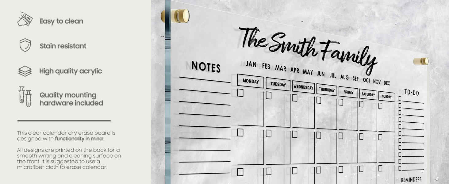 Personalized CLEAR Acrylic Wall Calendar Dry Erase Acrylic Calendar for
