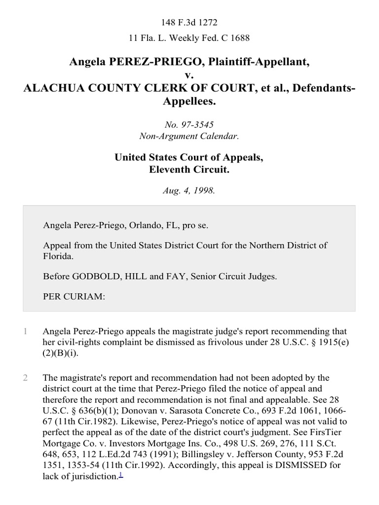 Angela Perez Priego v Alachua County Clerk of Court 148 F 3d 1272