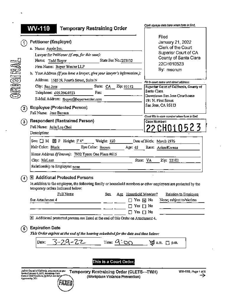 EA 110 Temporary Restraining Order Clerk stamps date / ea 110