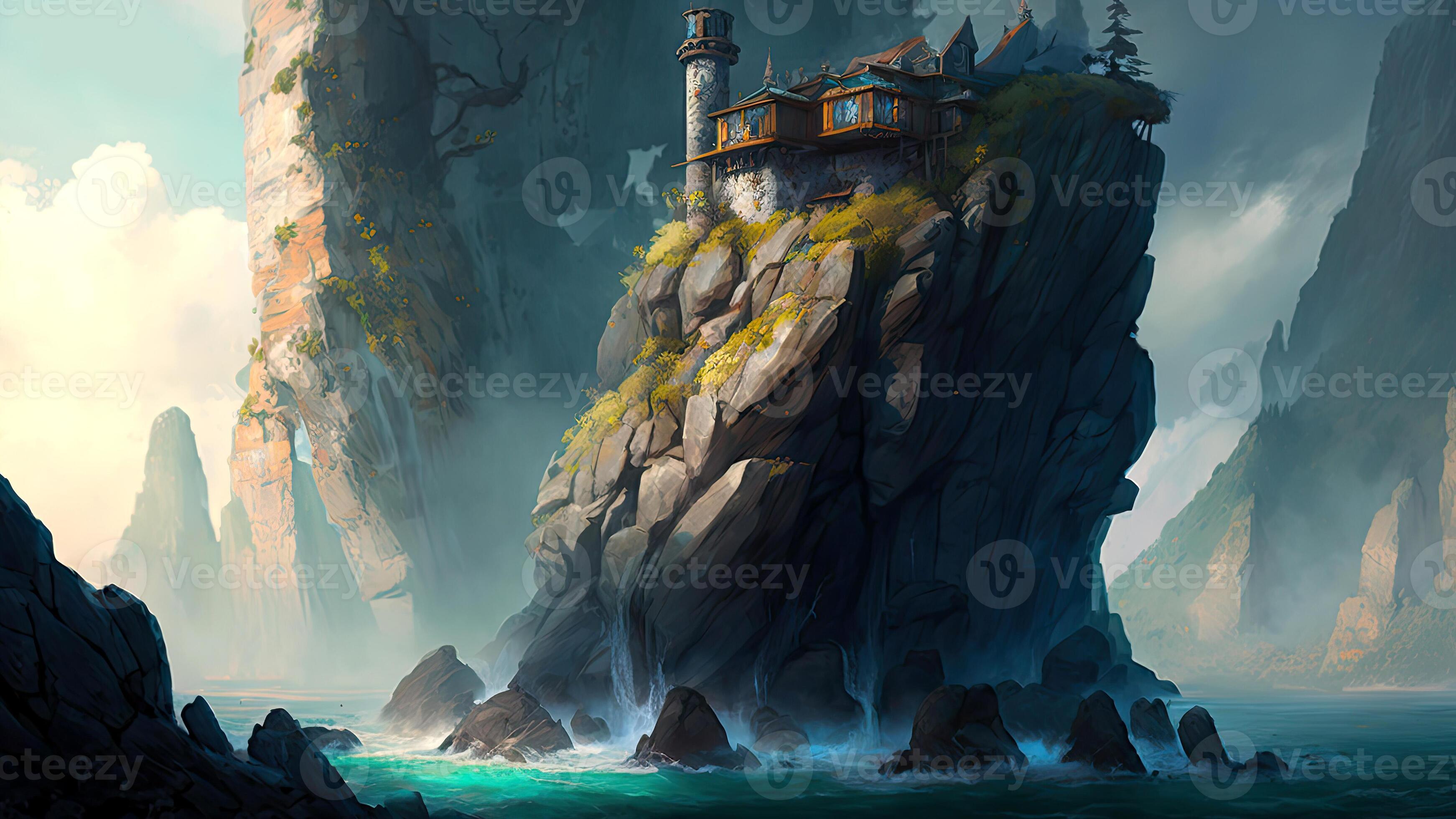 Hyper Realistic of Fantasy Futuristic Seaside City Landscape with Cliff