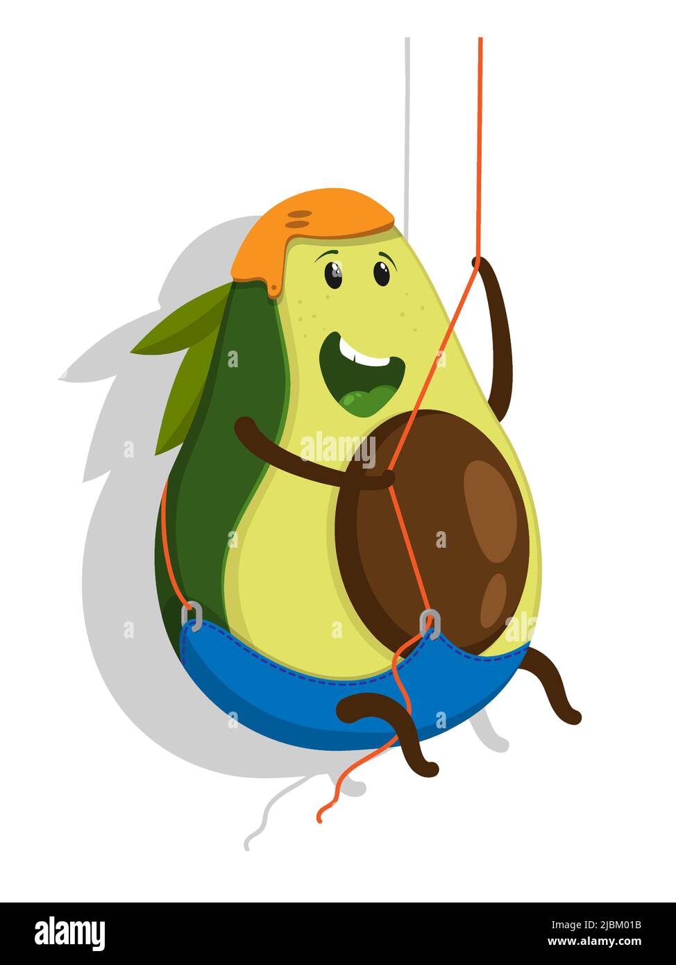 Cheerful sportsman avocado fruit climbs rope in climber equipment
