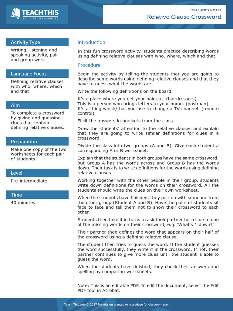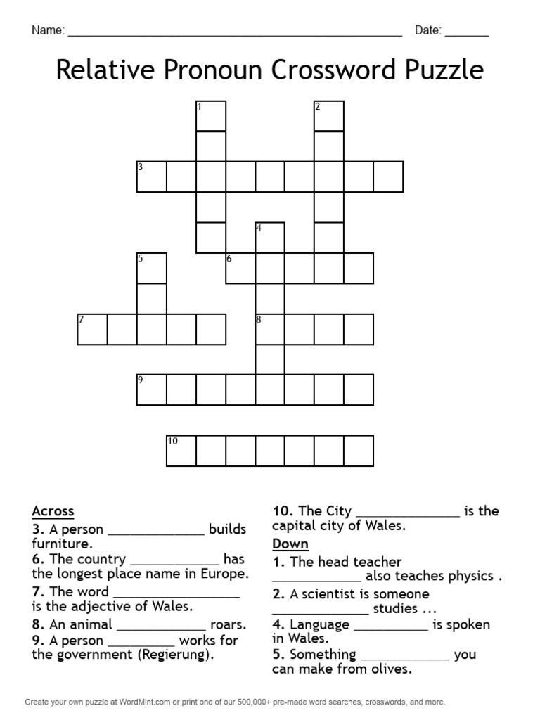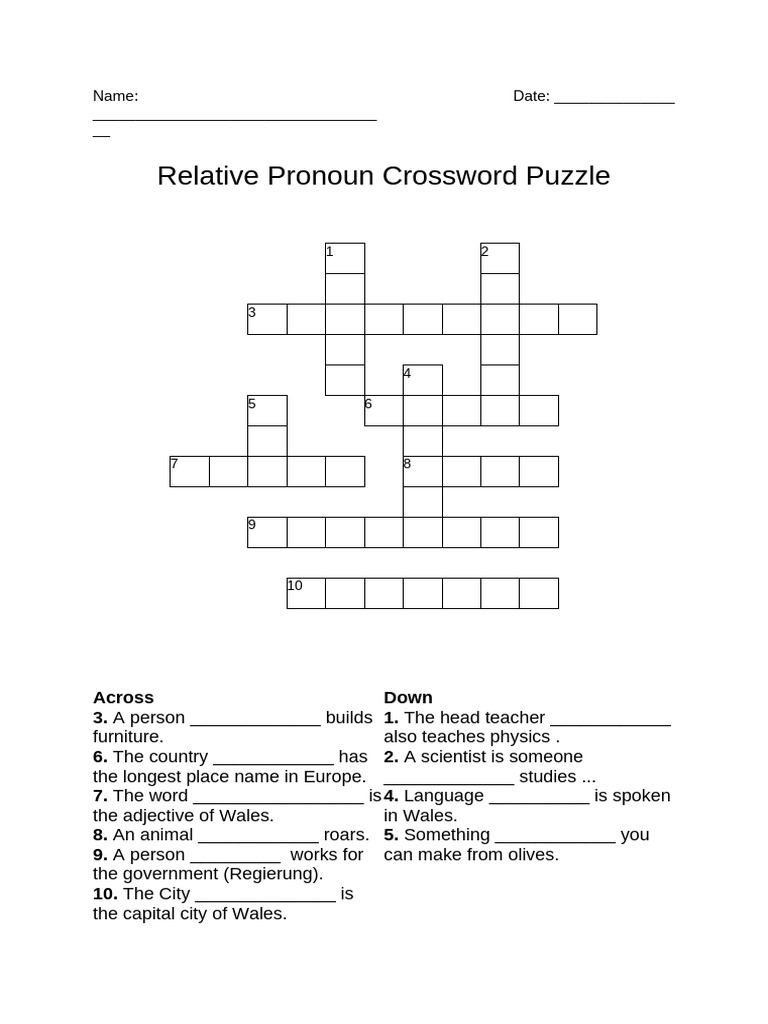 Relative Pronoun Crossword PDF Language Arts Discipline Foreign