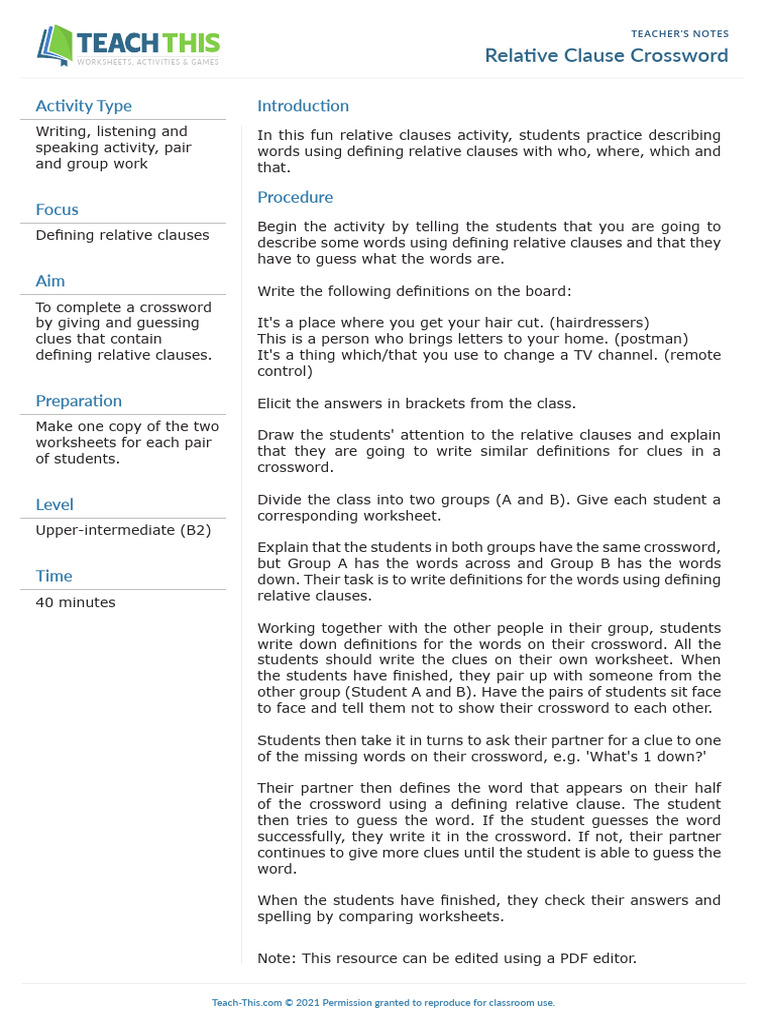 Defining relative clauses who/ which/ that/ where/ when Crossword Labs