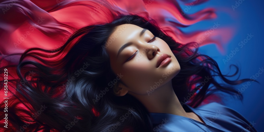 A serene young Asian woman with flowing hair lying gracefully with her