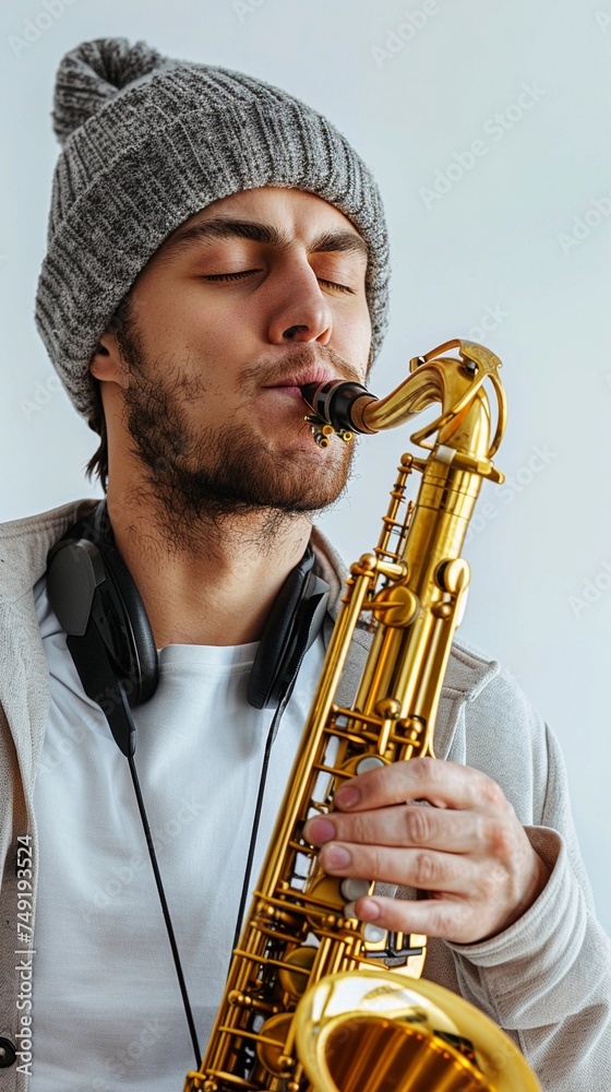 Man playing the saxophone with eyes closed lost in the music against