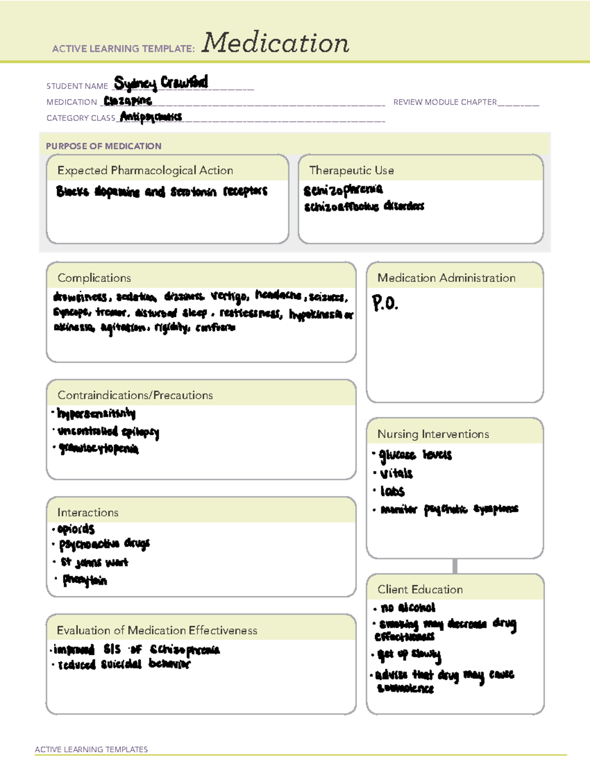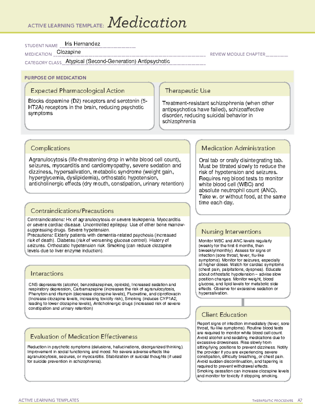 Clozapine pharm ACTIVE LEARNING TEMPLATES Medication STUDENT NAME