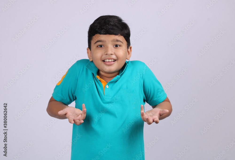 Puzzled and clueless indian boy with arms out shrugging her shoulders