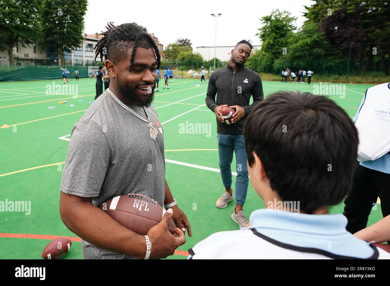Clyde Edwards Helaire from the NFL team Kansas City Chiefs interacts
