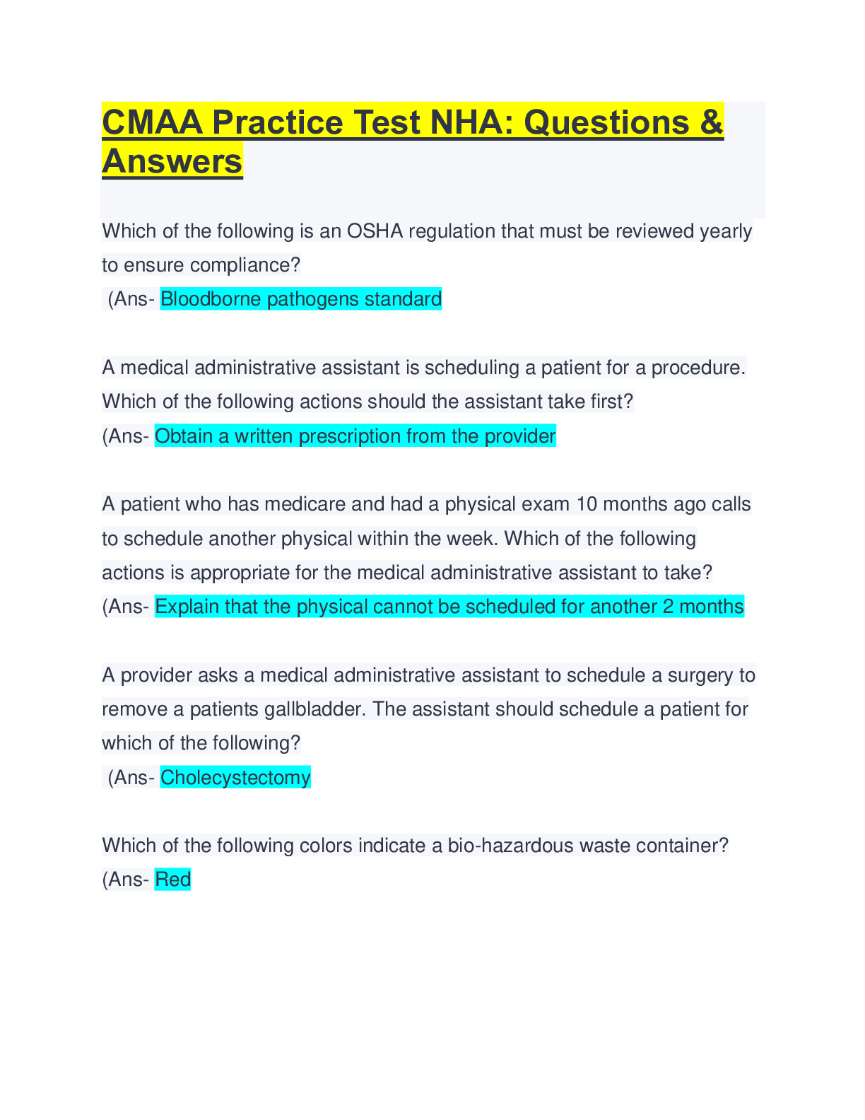 CMAA practice test nha questions and answers latest 100% correct