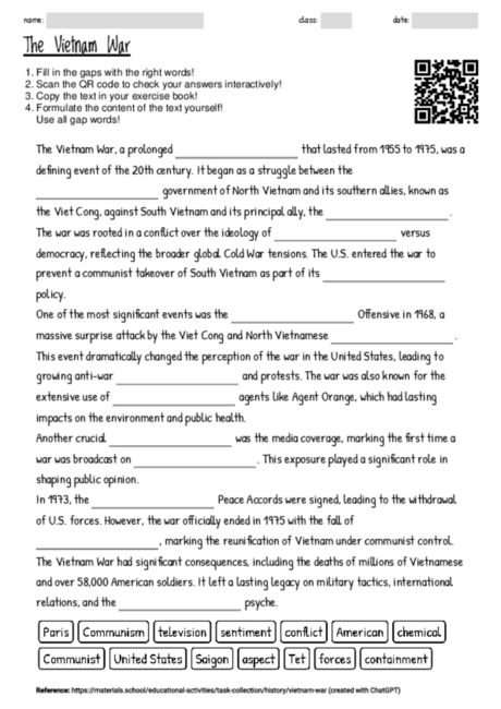 Worksheet with the topic The Vietnam War MATERIALS SCHOOL
