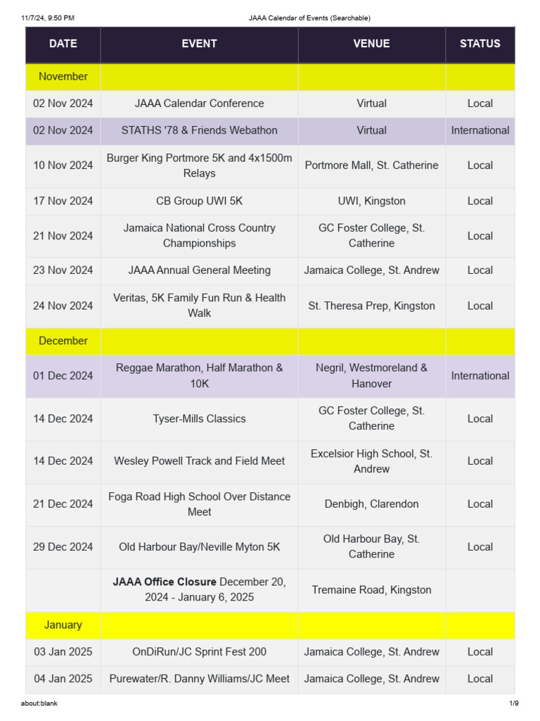 JAAA Calendar of Events 2024 2025 PDF Sport Of Athletics