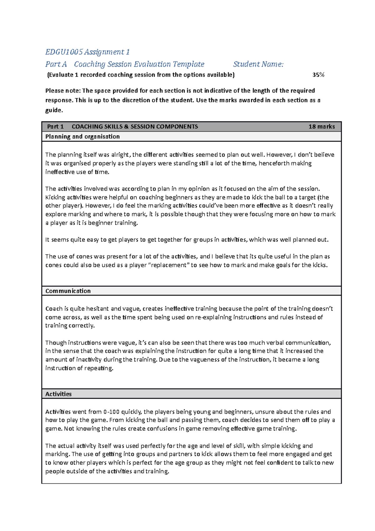 Task 1 Part A Coaching Session Evaluation Template S2 2022 EDGU1005