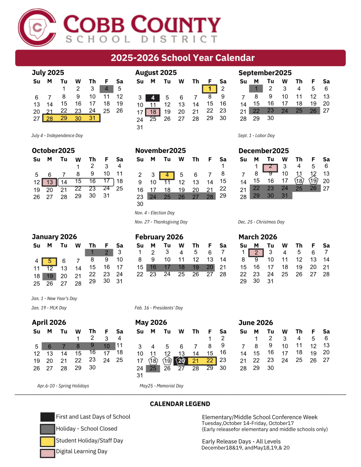Cobb County School Calendar with Holidays 2025 2026