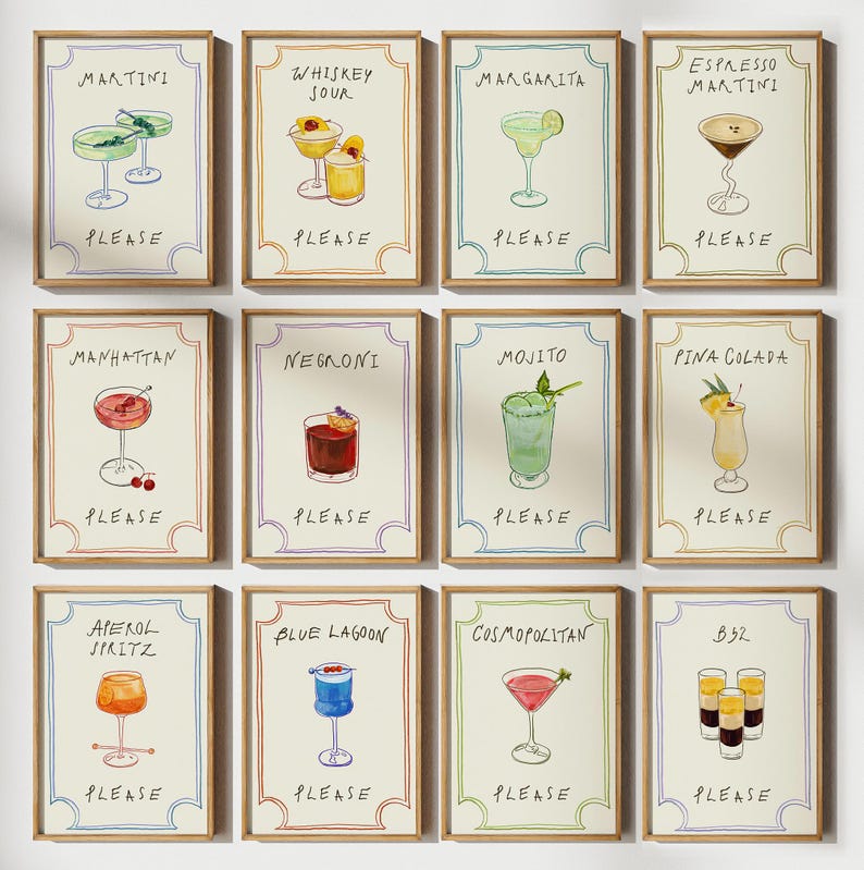 Gallery Wall Set of 12 Hand Drawn Cocktail Cocktail Wall Art