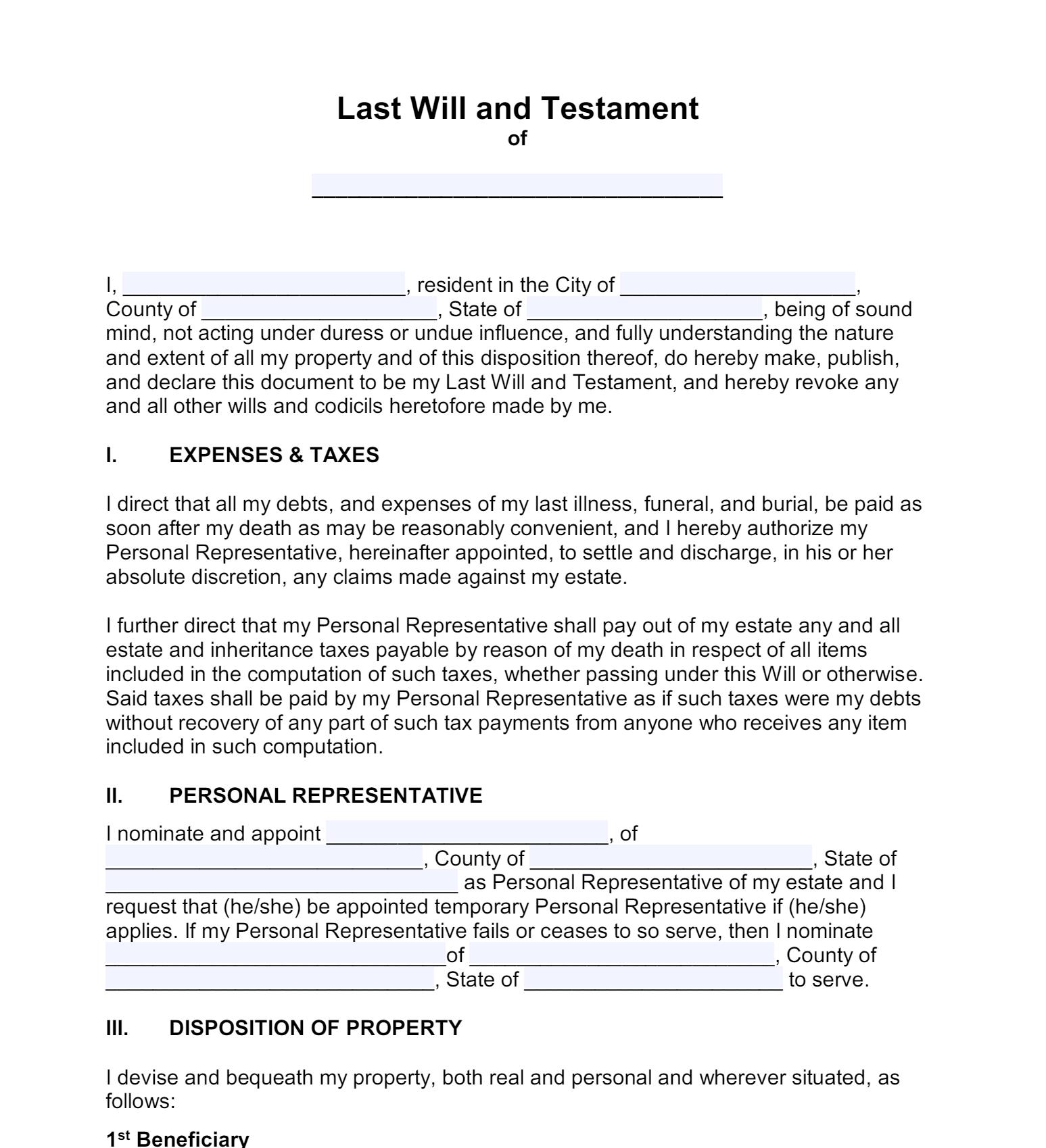Free Last Will and Testament Form Templates