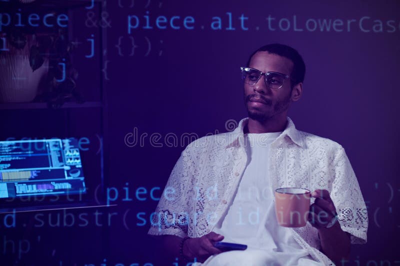 Smart it Developer Drinking Coffee Cup while Working Code on Pc Screen