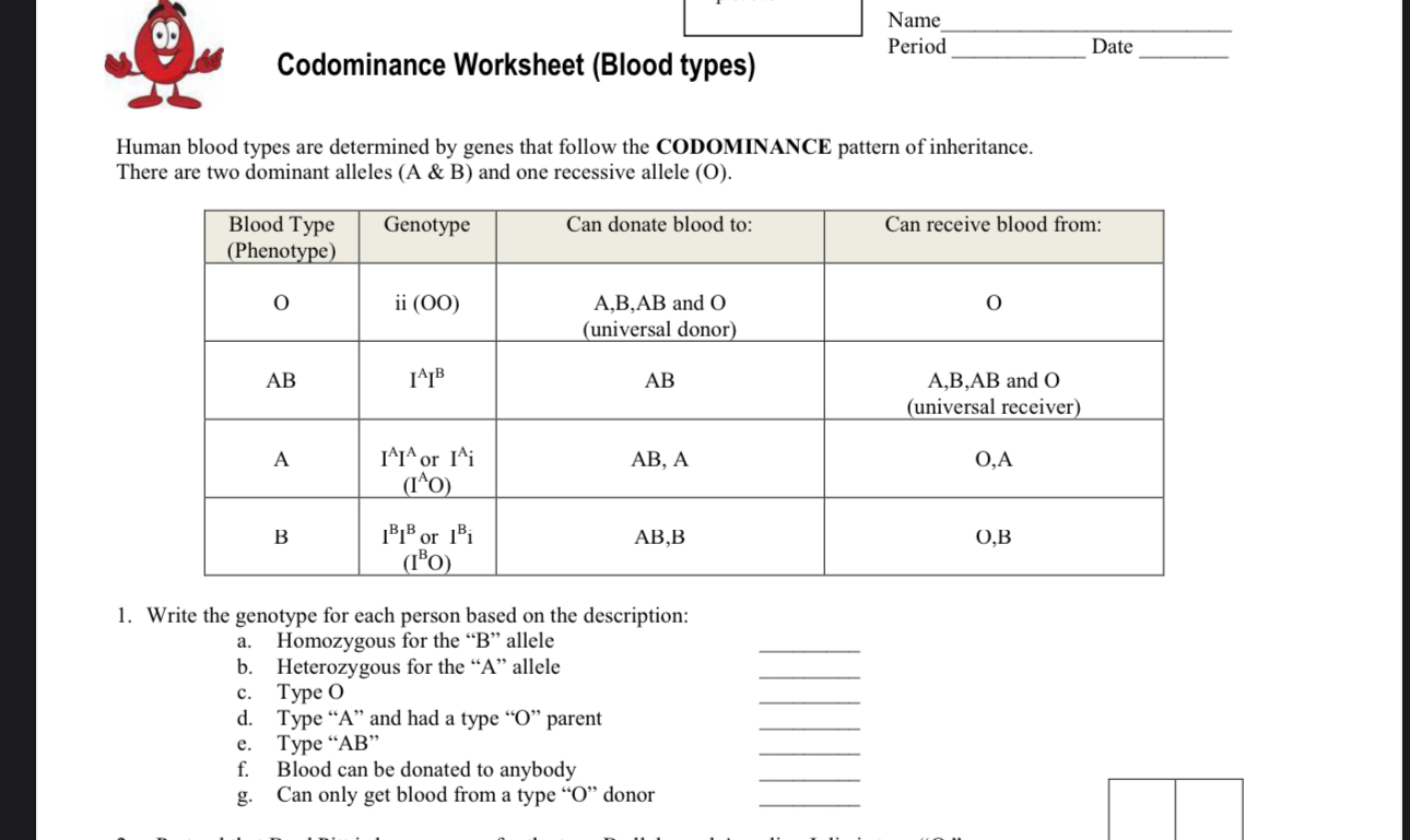Codominance Worksheet (Blood Types) : Name: Date: Period PDF