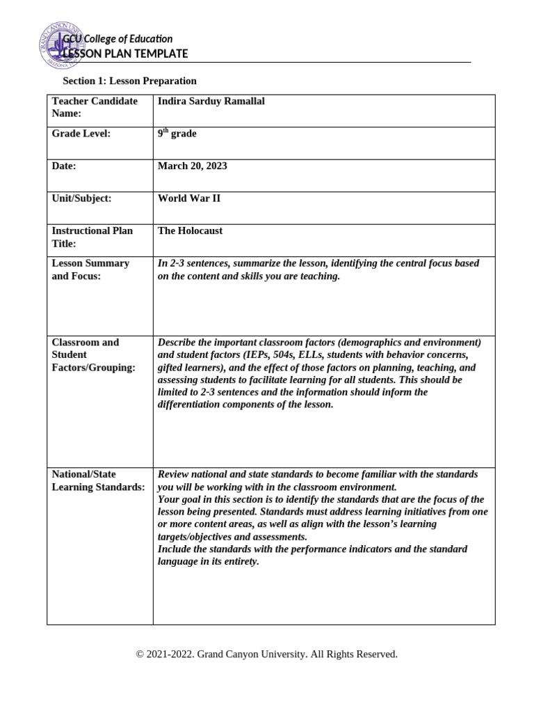 Coe lesson plan template LESSON PLAN TEMPLATE Grand Canyon University
