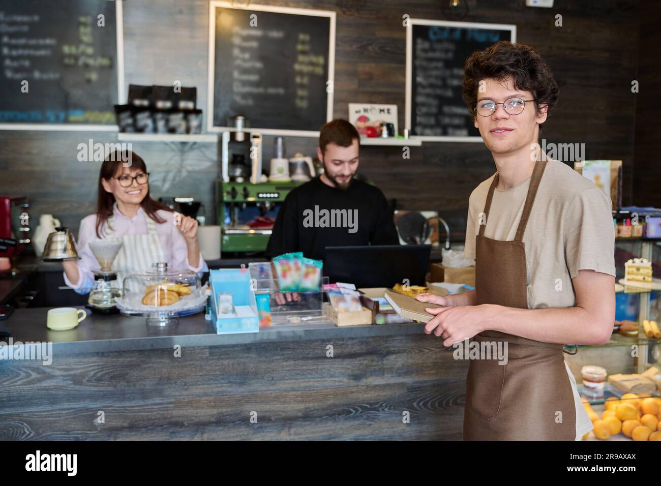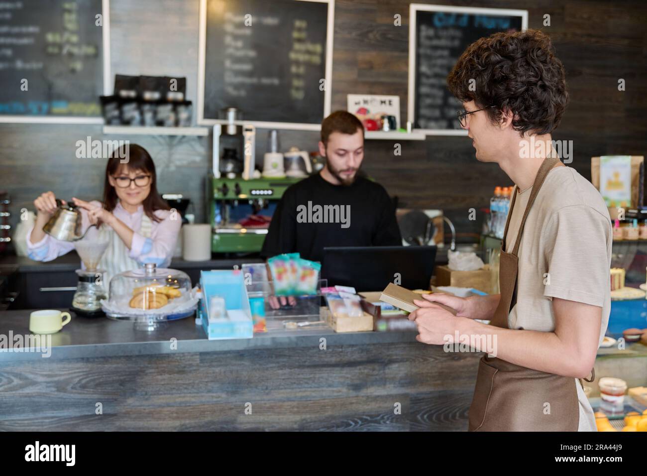 Coffee shop workers a young guy in an apron in focus Stock Photo Alamy