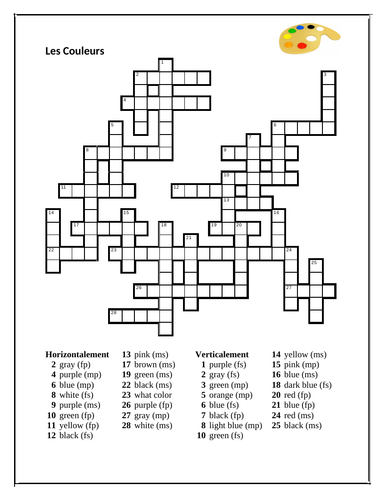 French Colours Crossword Puzzle Mots croisés français sur les couleurs