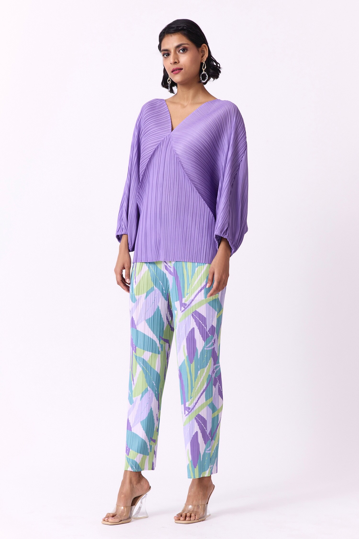 Buy Purple 100% Polyester Printed Floral V Neck Fleur And Pleated Pant