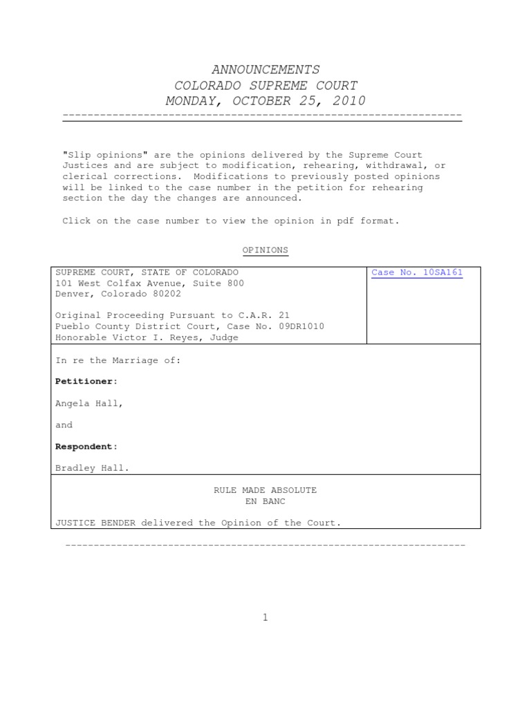 Announcements Colorado Supreme Court MONDAY OCTOBER 25 2010 PDF