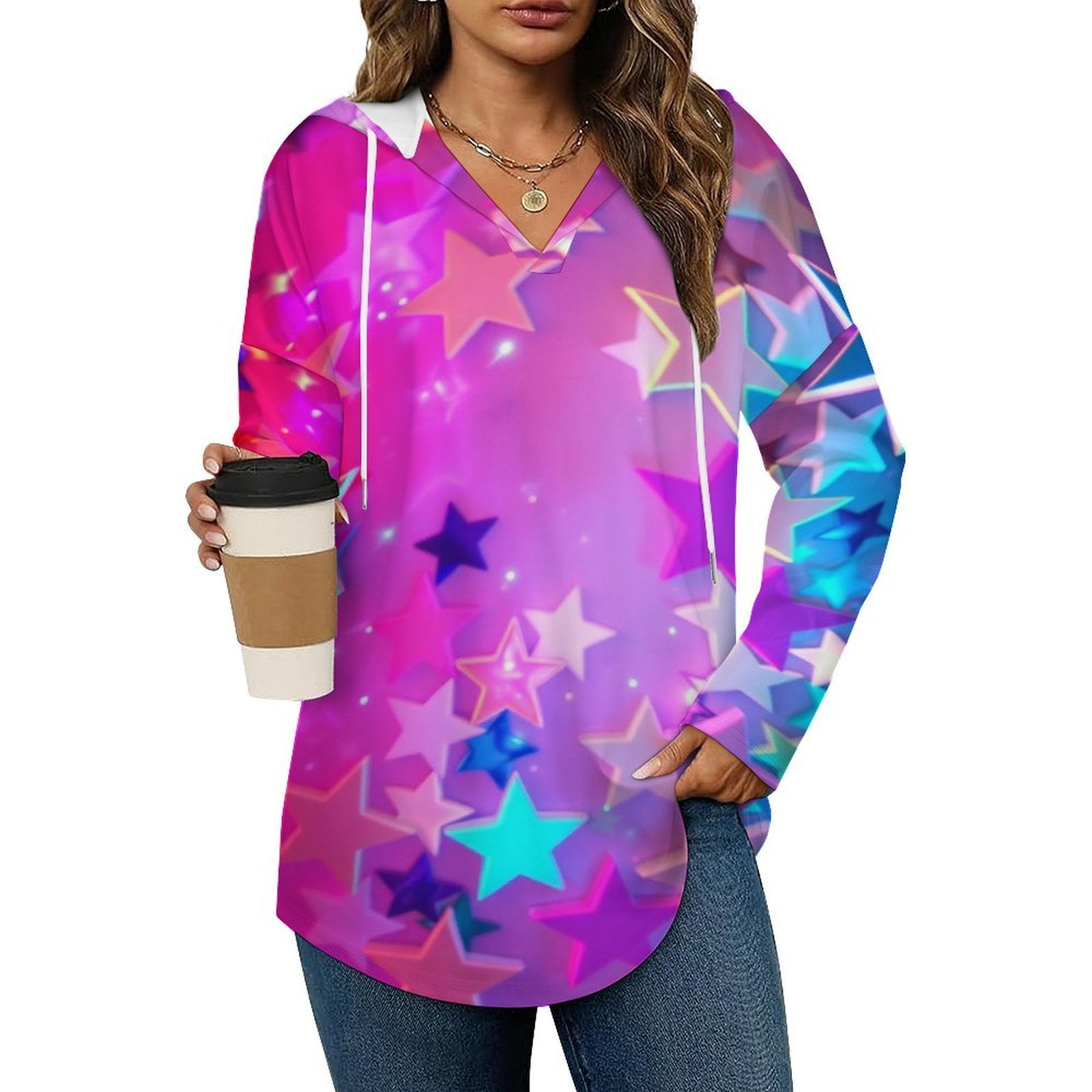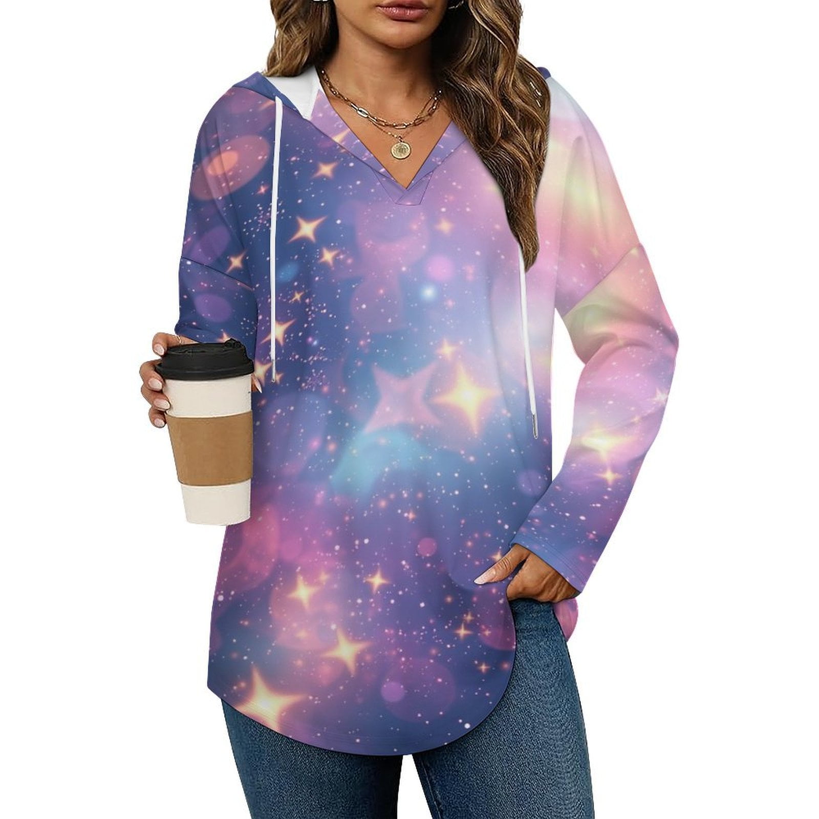 Colored Stars Women #39 s Hoodies V Neck Long Sleeve Sweatshirt Drawstring