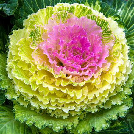 Beautiful ornamental cabbage in the landscape design Rural garden plot