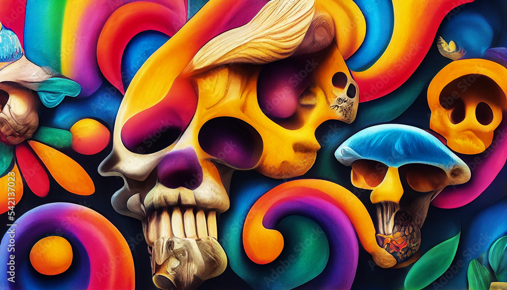 Midjourney render of abstract art wallpaper with psychedelic skulls and