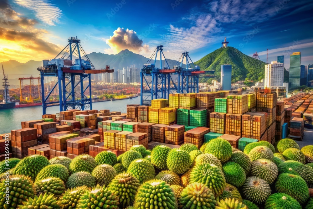 Vibrant durian fruit crates stacked at bustling port juxtaposed
