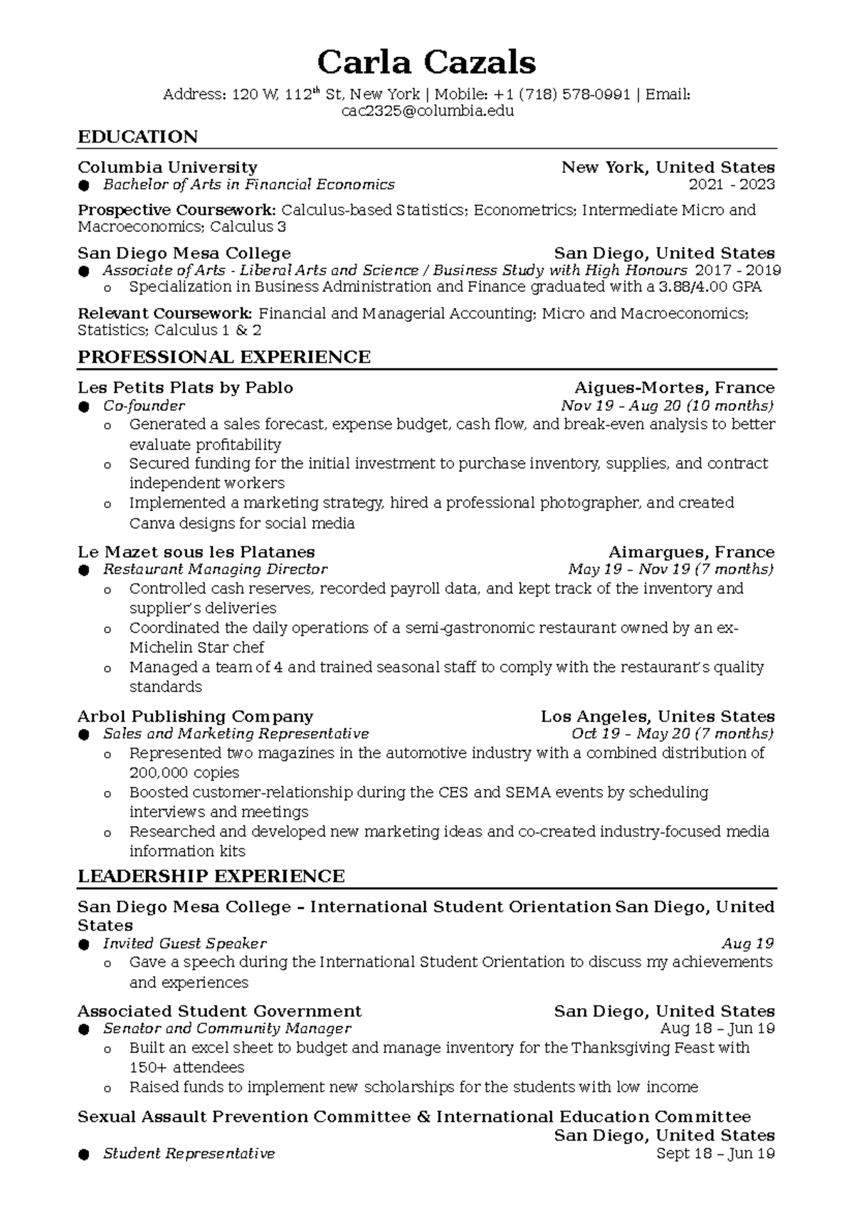 Resume Carla Cazals R4801 Columbia University Studocu