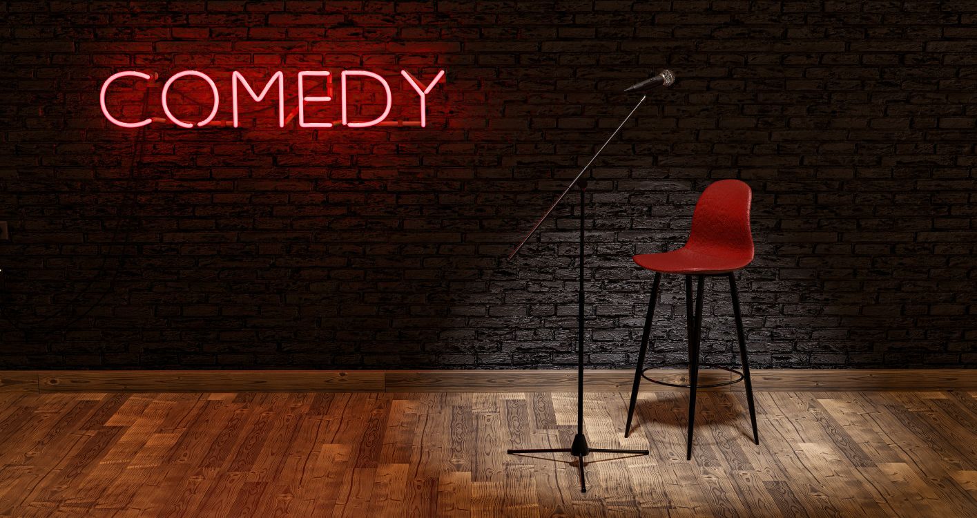 Neon COMEDY sign above microphone and stool lively club atmosphere For