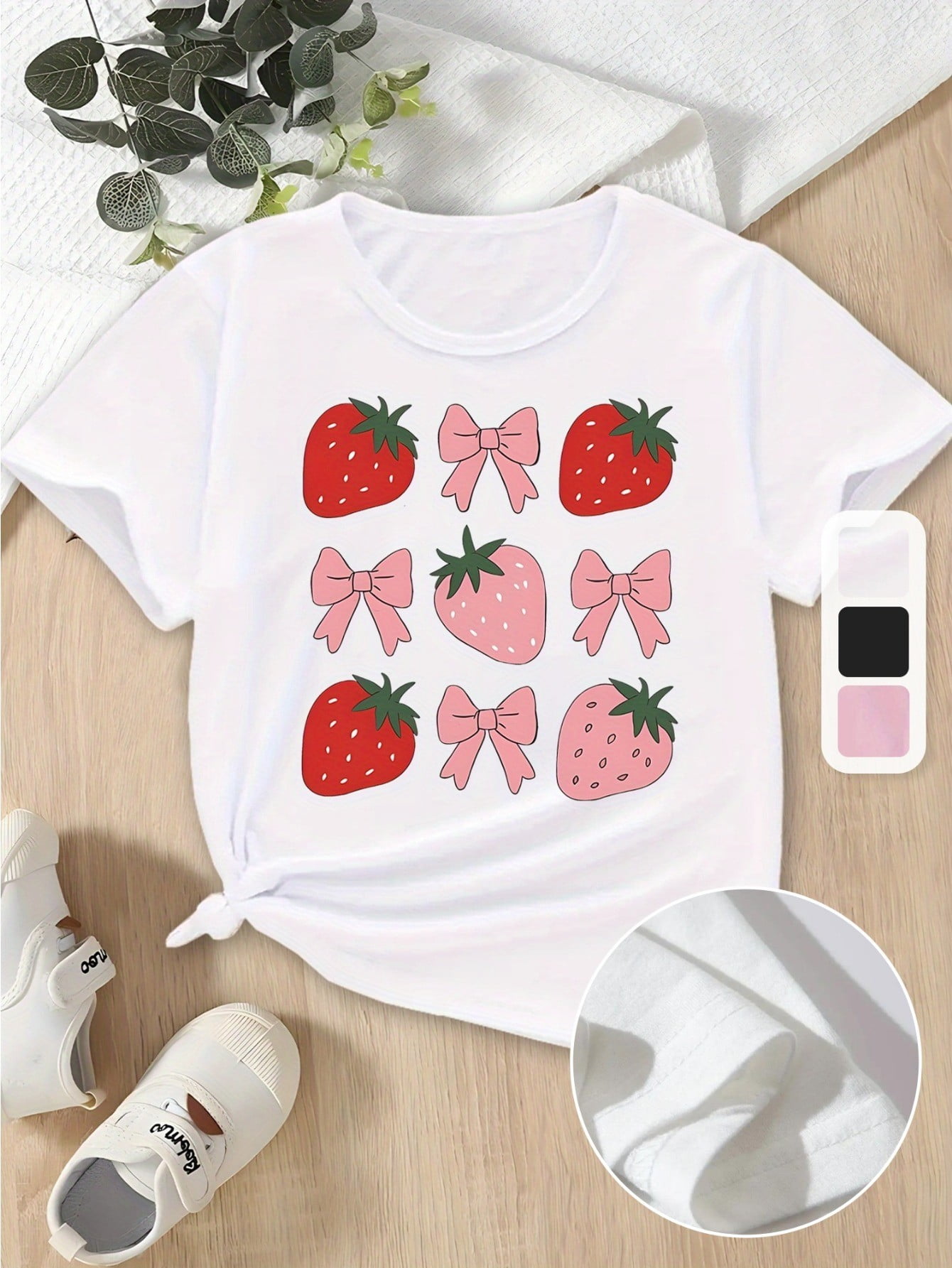 Girls #39 Comfy Stretchy Strawberry Bow Print T Shirt Breathable Casual