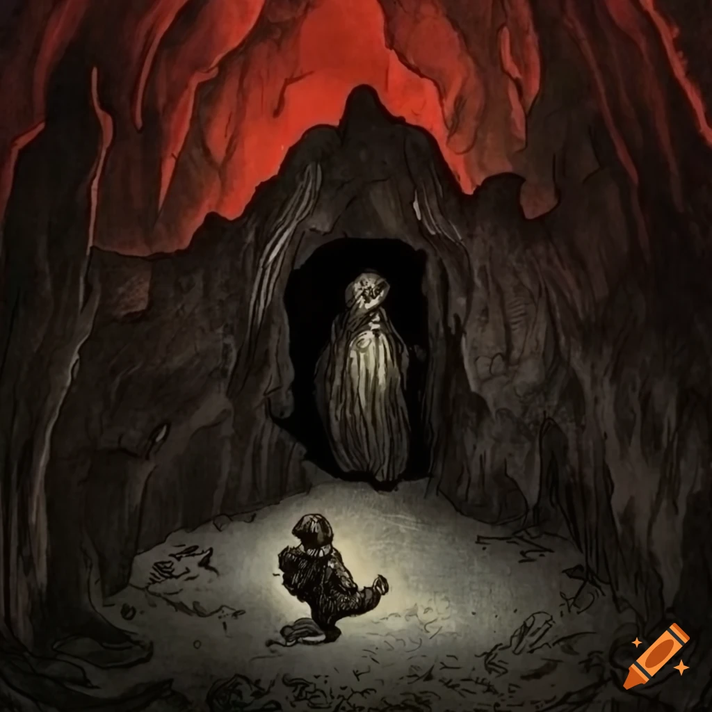Vimes entering a cave in the style of Gustave Doré from the book Thud