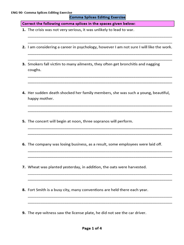 SOLUTION: Comma splices and fused sentences Studypool Worksheets