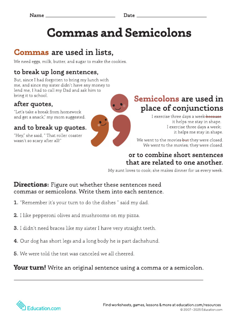 Commas and Semicolons Worksheet PDF