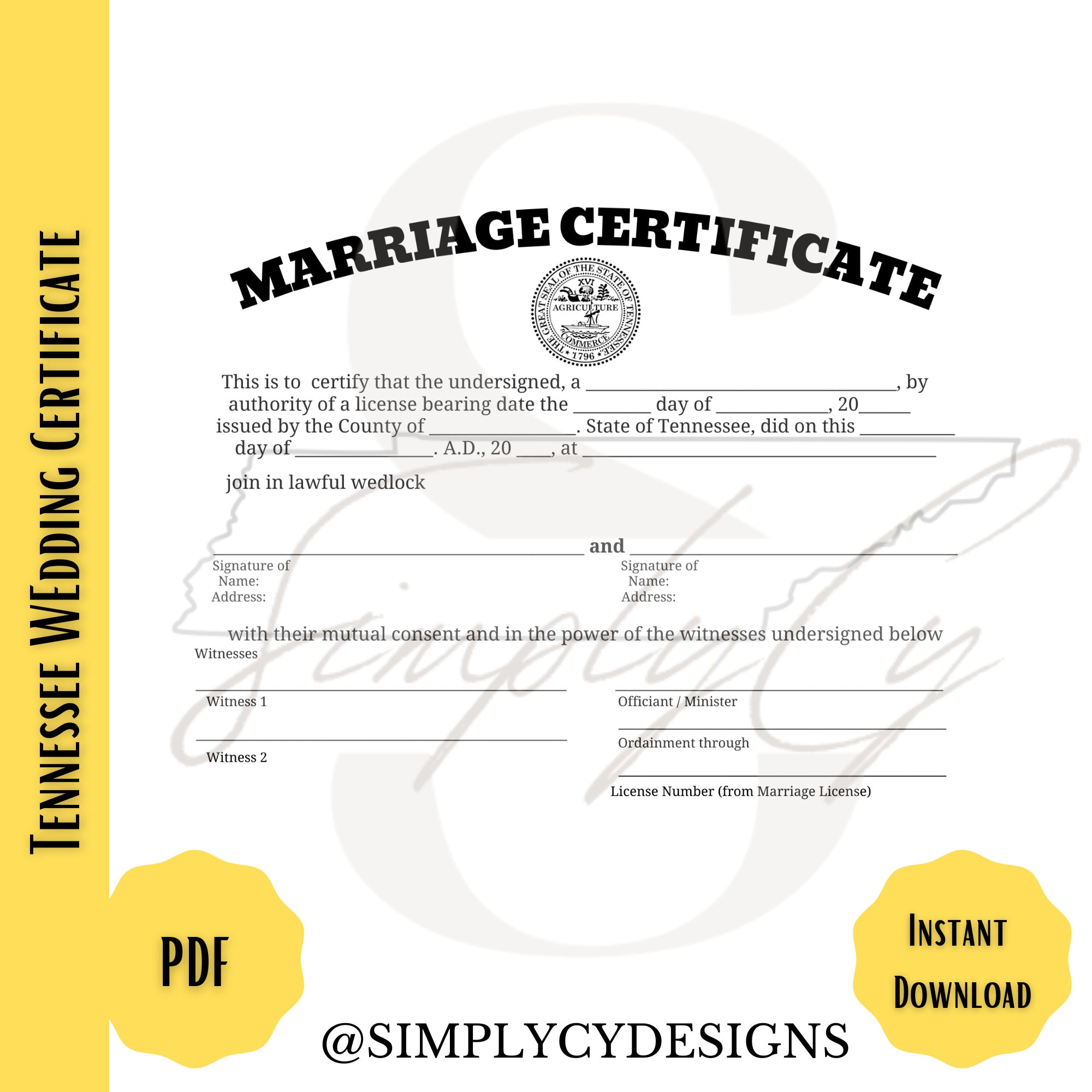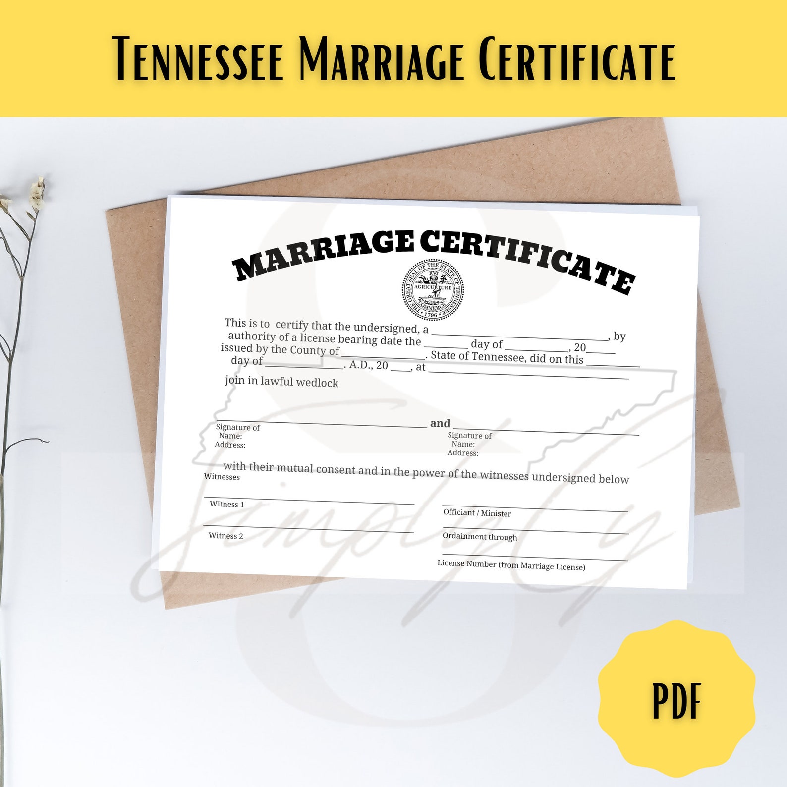 Tennessee Commemorative Marriage Certificate Digital Download