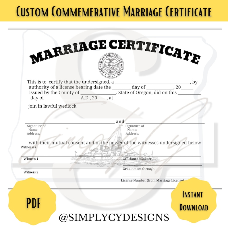 Oregon Commemorative Marriage Certificate Digital Download Oregon