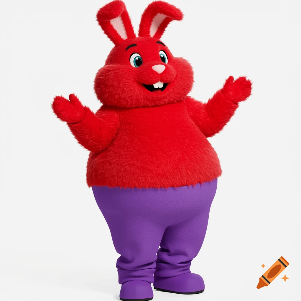 A red furry rabbit mascot with big teeth and floppy ears wearing