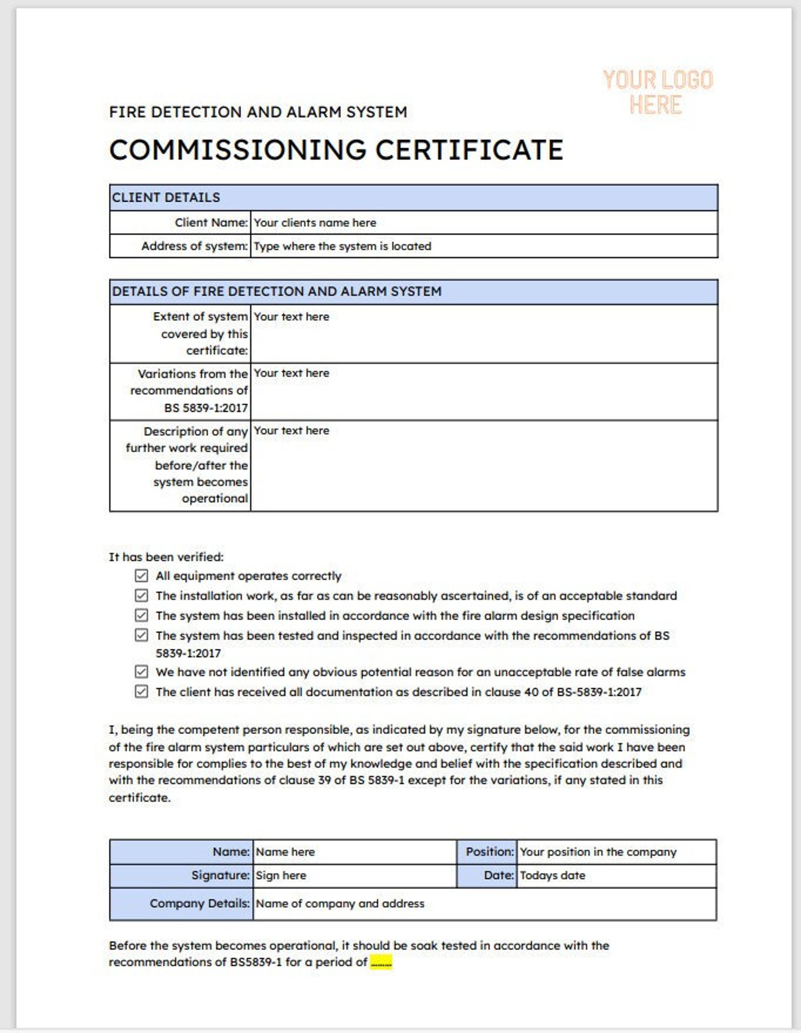 BS5839 1:2017 Fire Alarm Commissioning Certificate Template Etsy