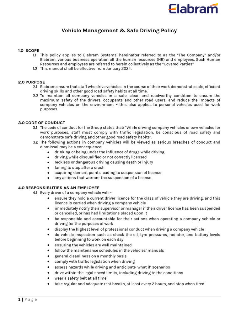 Vehicle Management Safe Driving Policy PDF Driving Traffic