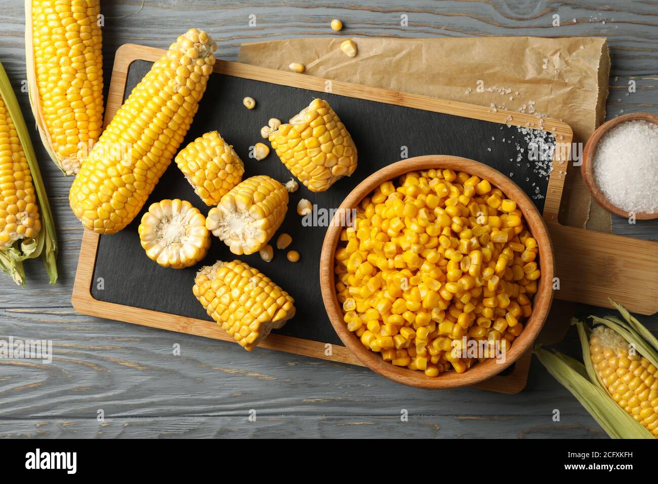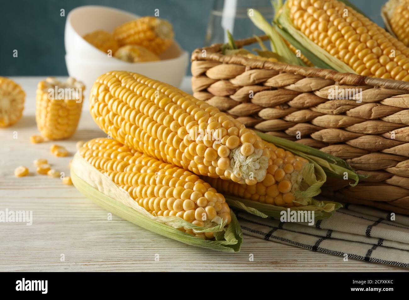 Composition with fresh raw corn and cutting board on wooden table Stock