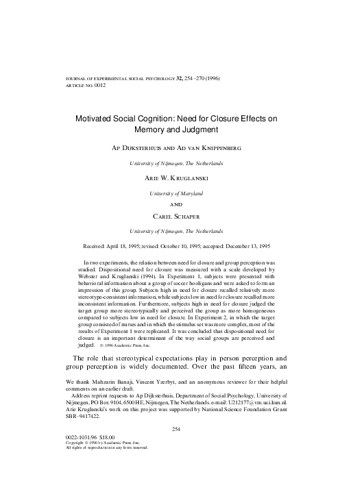(PDF) Dijksterhuis A P Van Knippenberg A D Kruglanski A W