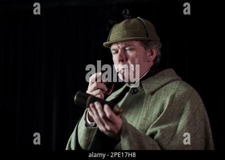 Depiction of Arthur Conan Doyle s legendary fictional detective holding