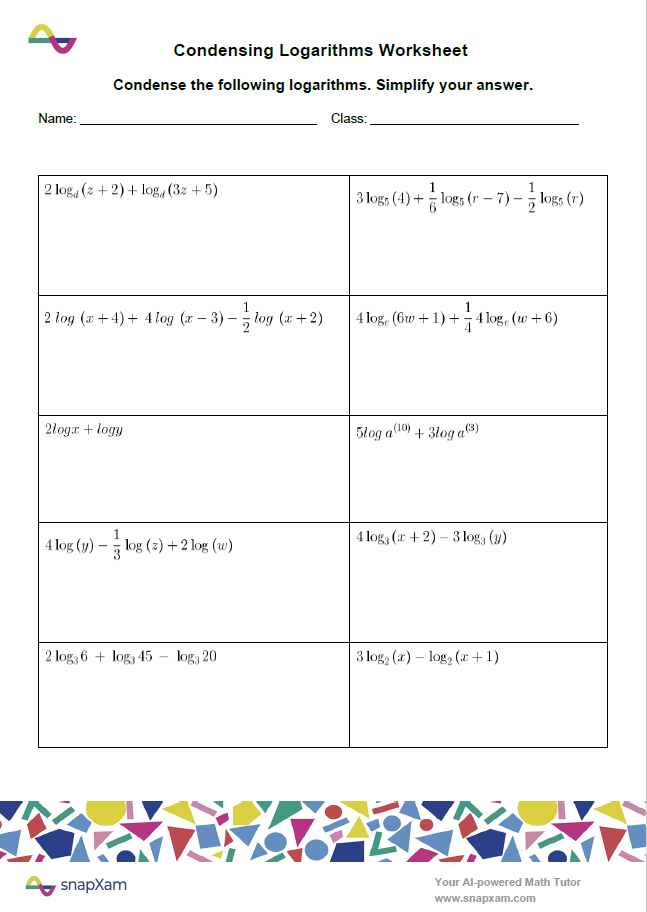 Condensing Logarithms Worksheets SnapXam