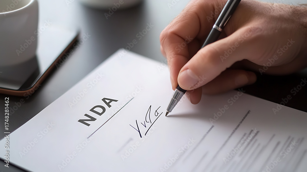 Foto de Stock Signing a Confidentiality Agreement: A hand signs an NDA