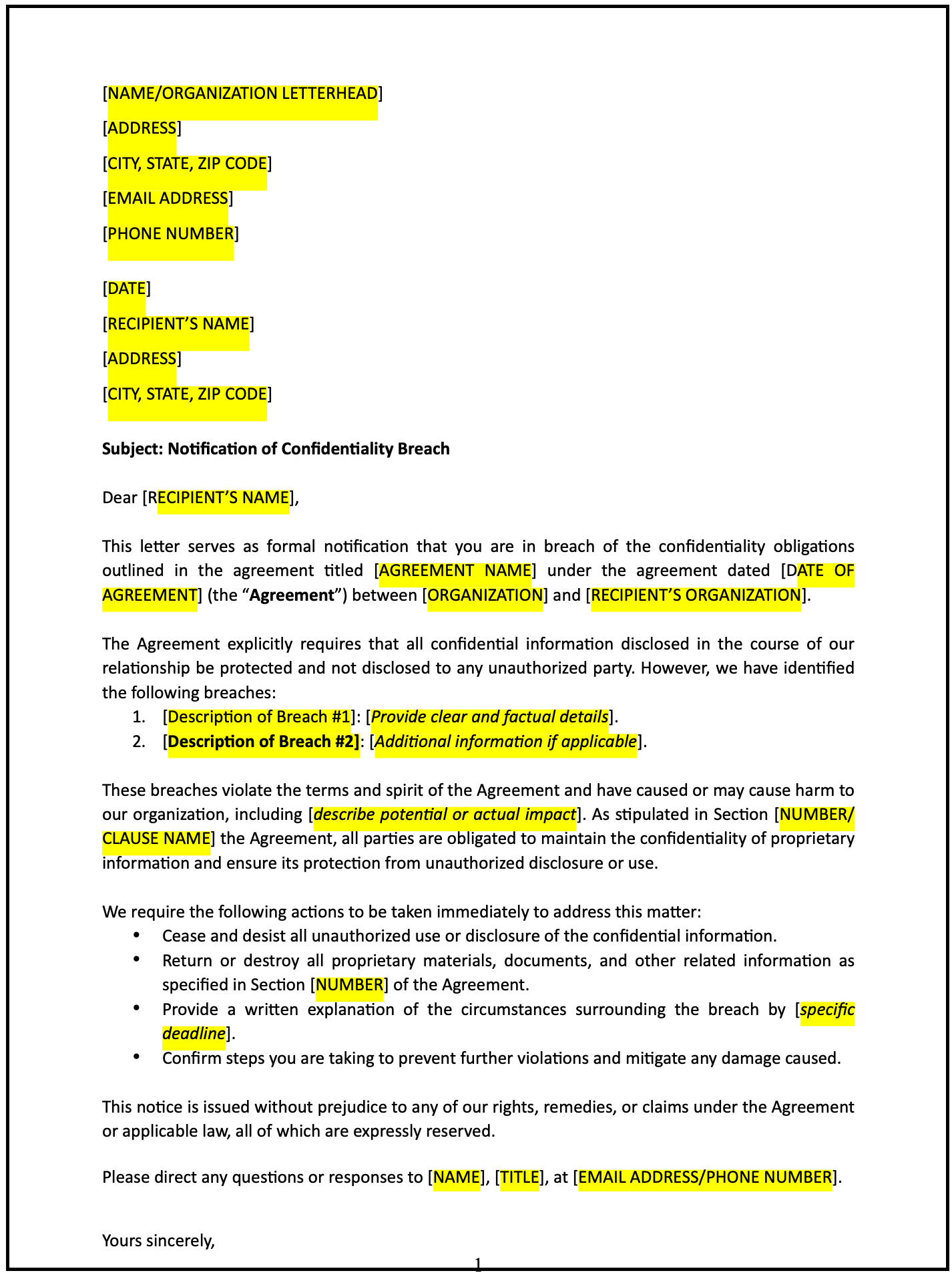 Notification letter of confidentiality breach: Free template